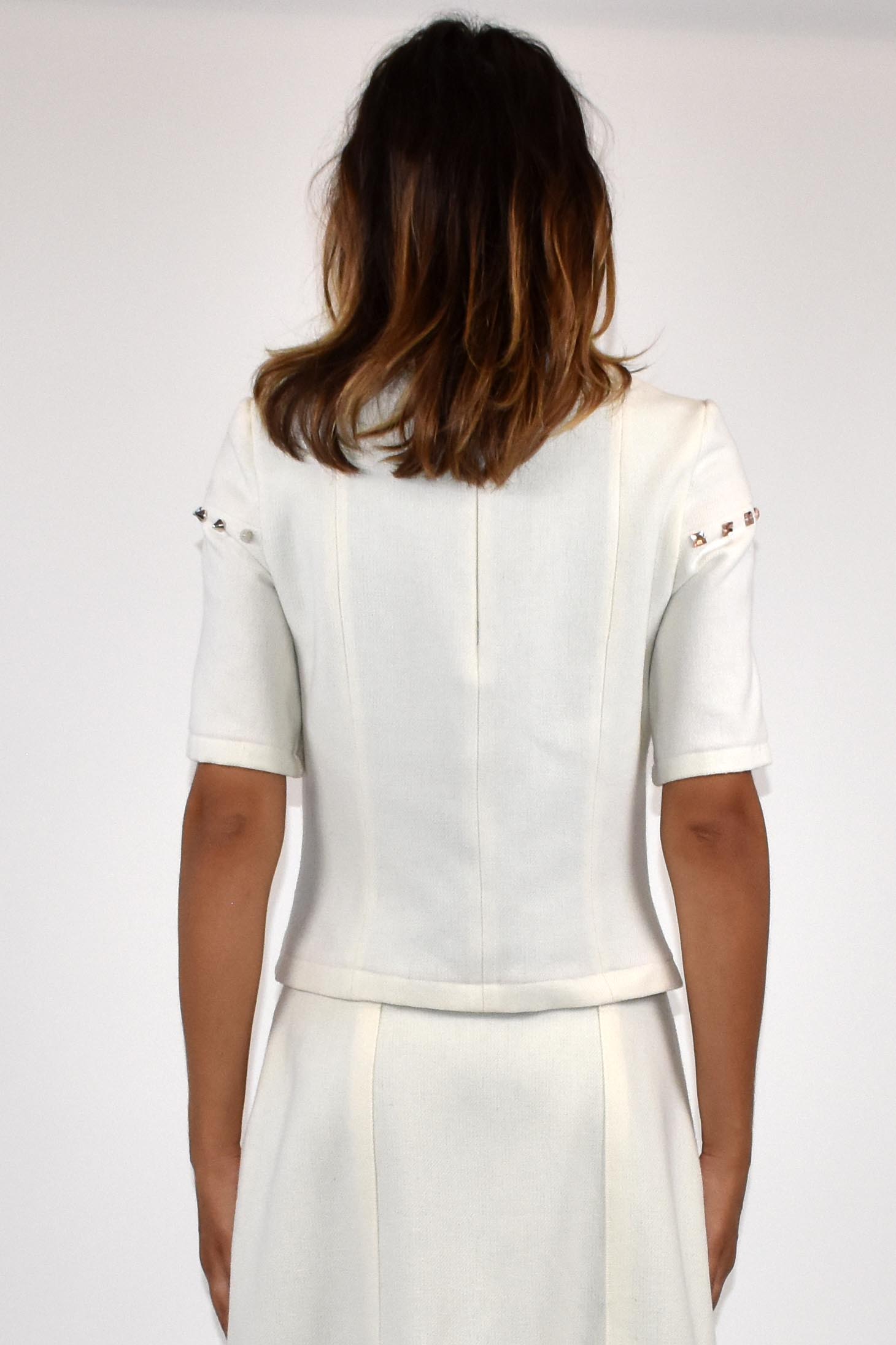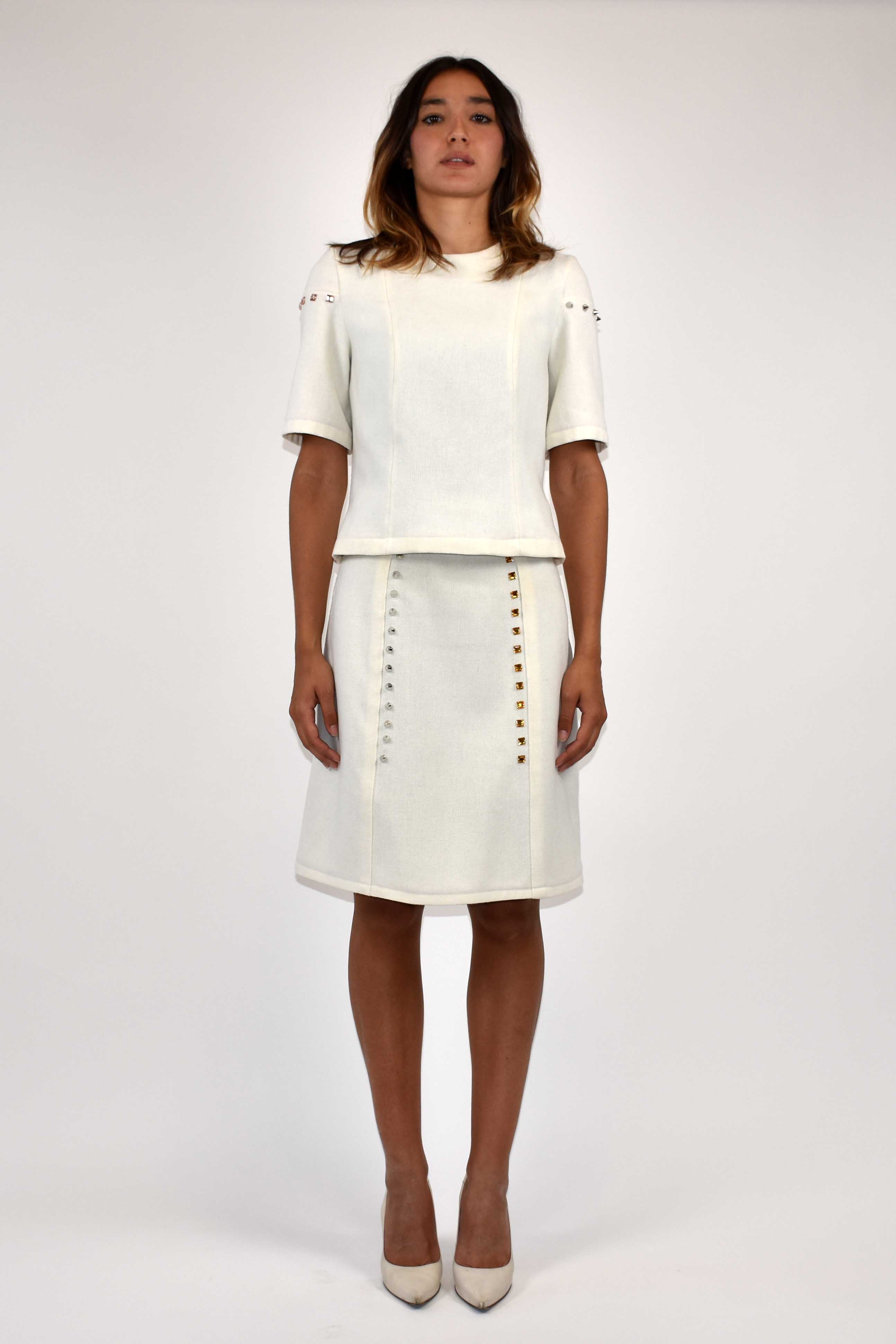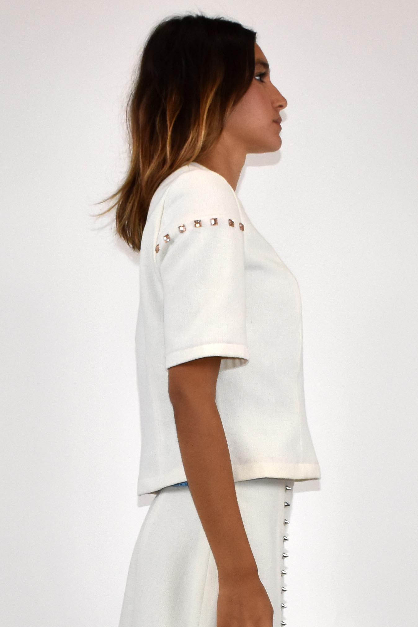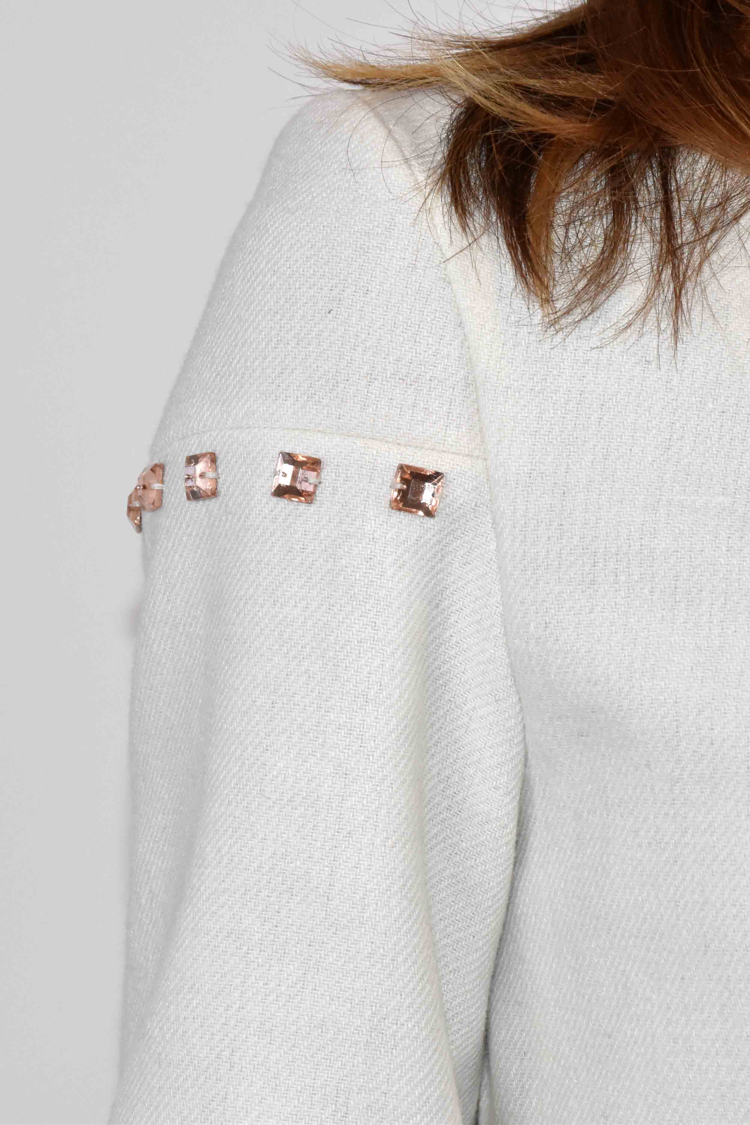 La blusa Precious in flanella di lana color avorio è caratterizzata da un motivo a teli e arricchita da due linee orizzontali di cristalli e borchie sulle maniche, fodera in cupro celeste.Il design rende la blusa adatta a tutte le fisicità.