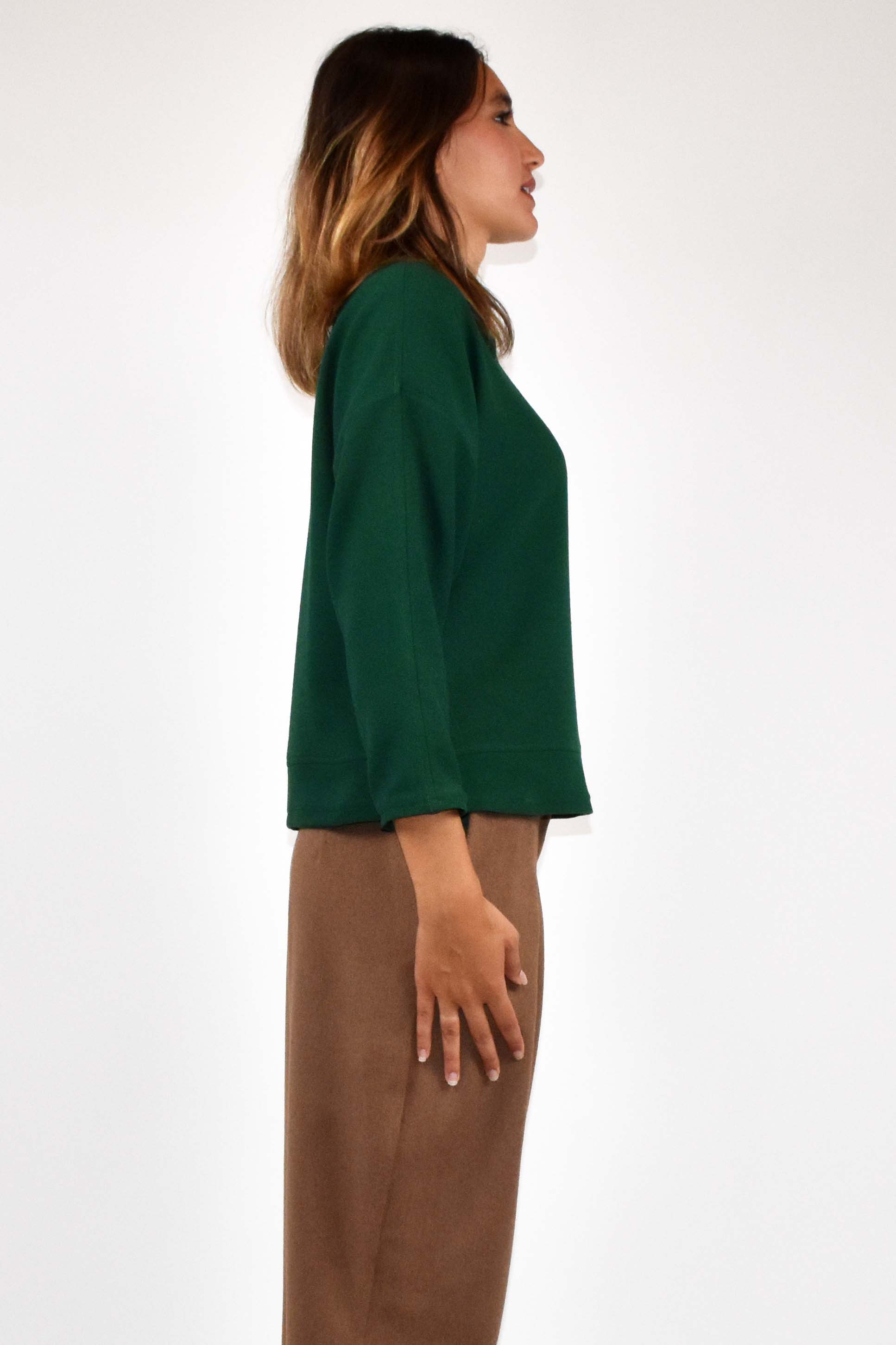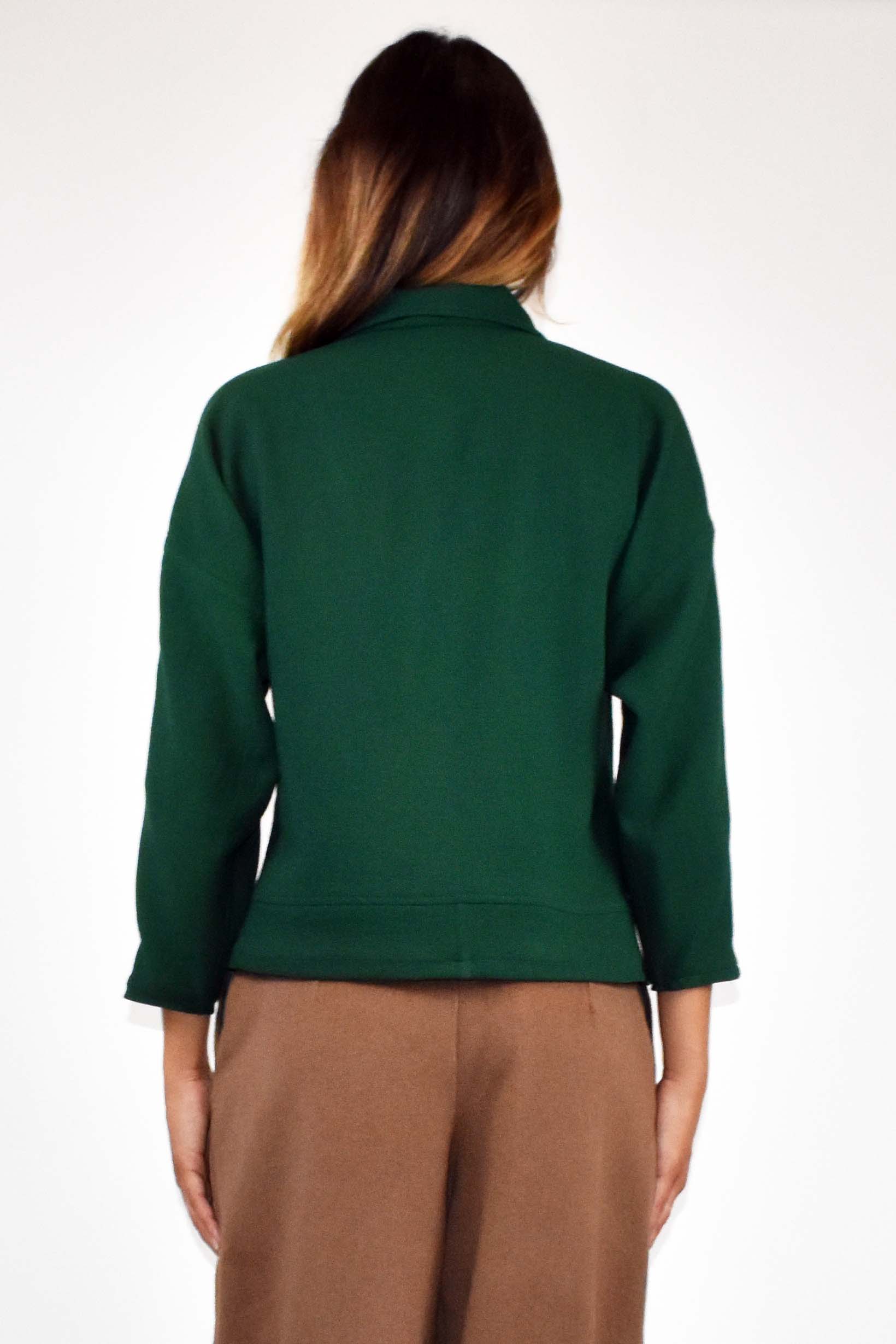 La blusa Foresta in crepe singolo di lana color verde foresta è caratterizzata da un design semplice con maniche a kimono e collo a polo che la rende adatta a tutte le fisicità e a molteplici abbinamenti.
