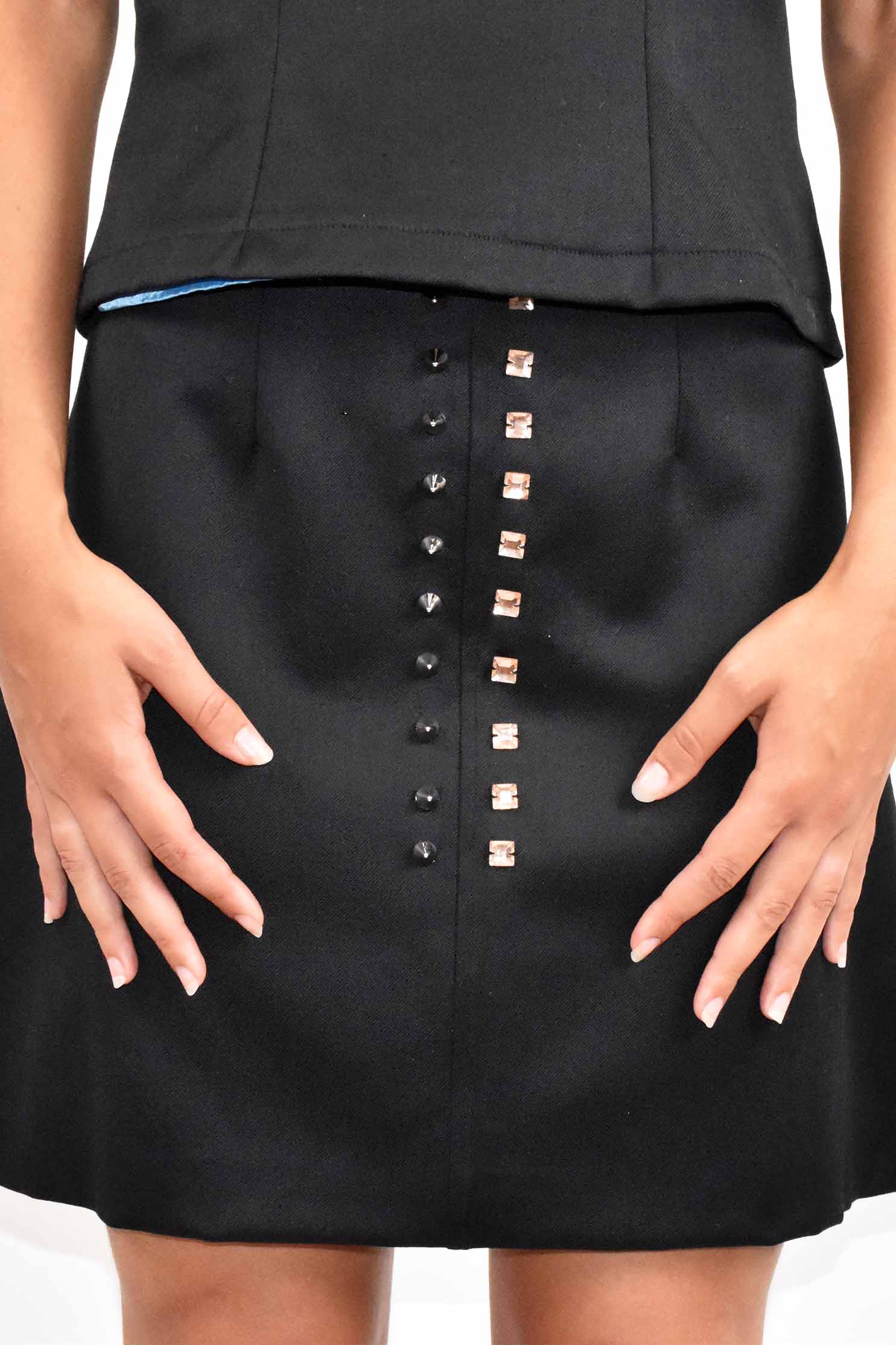 La minigonna Precious in faille di lana nero è caratterizzata da una silhouette svasata e arricchita da due linee verticali di cristalli e borchie. Fodera in twill di cupro verde smeraldo. La vestibilità è regolare e si adatta a tutte le fisicità.