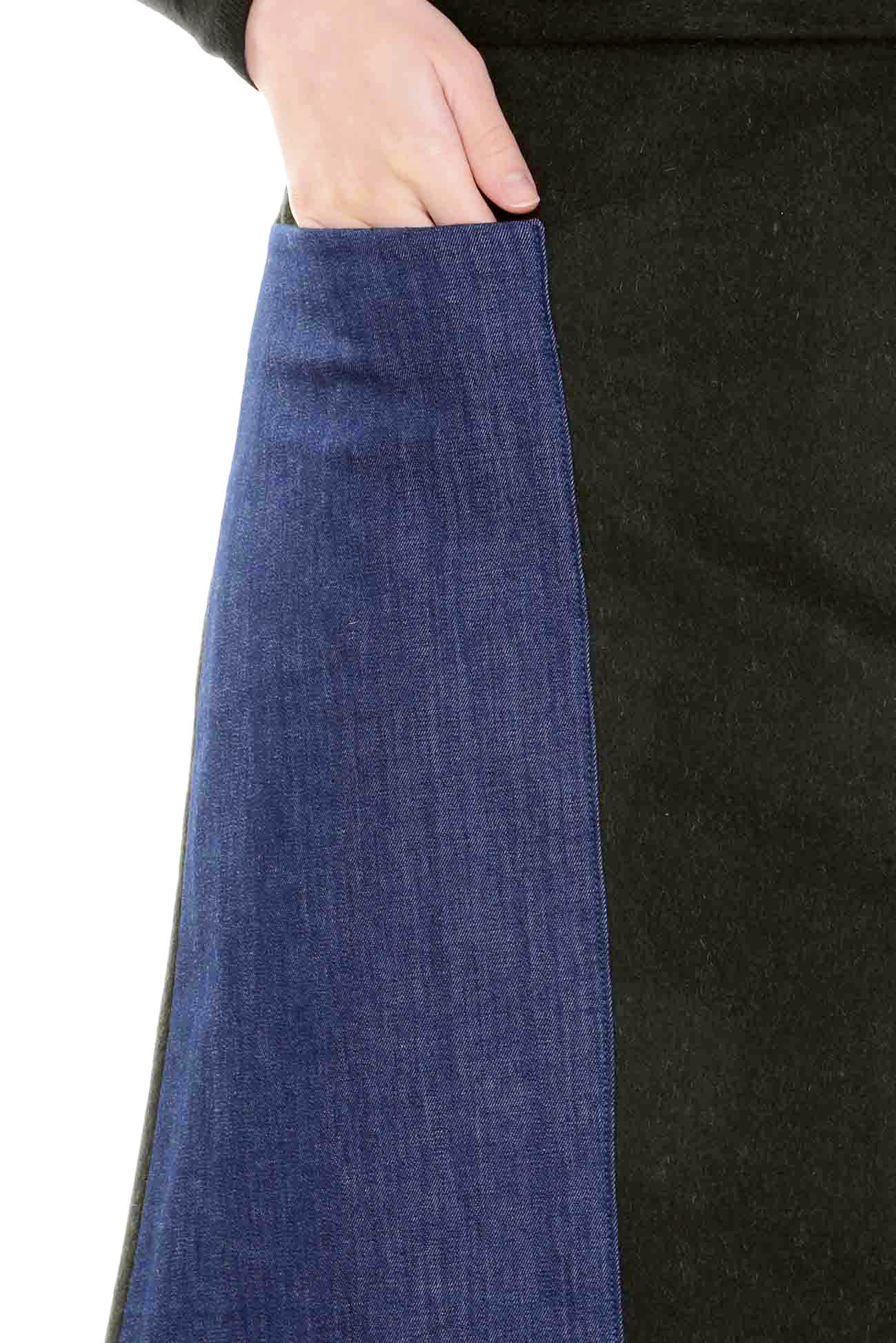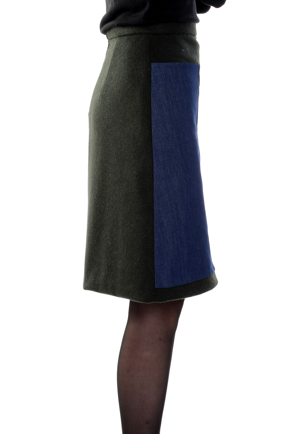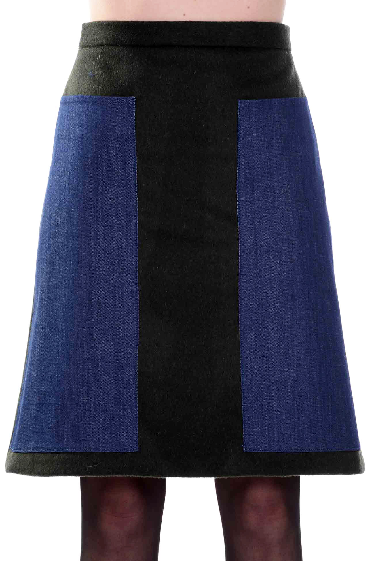 La gonna in loden verde bottiglia Tasca è caratterizzata da una linea svasata che si adatta a tutte le fisicità. Presenta sul davanti due grandi applicazioni in denim che contengono le tasche. La gonna è foderata in twill di cupro blu.