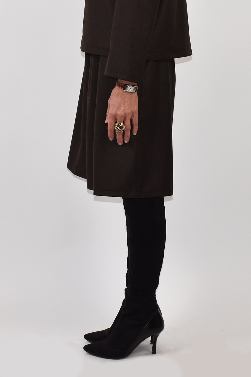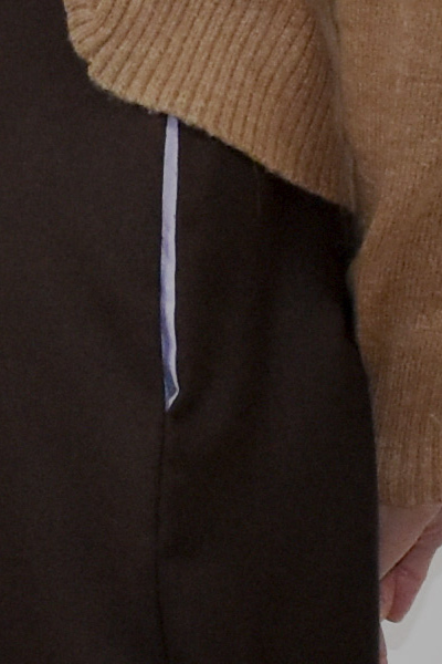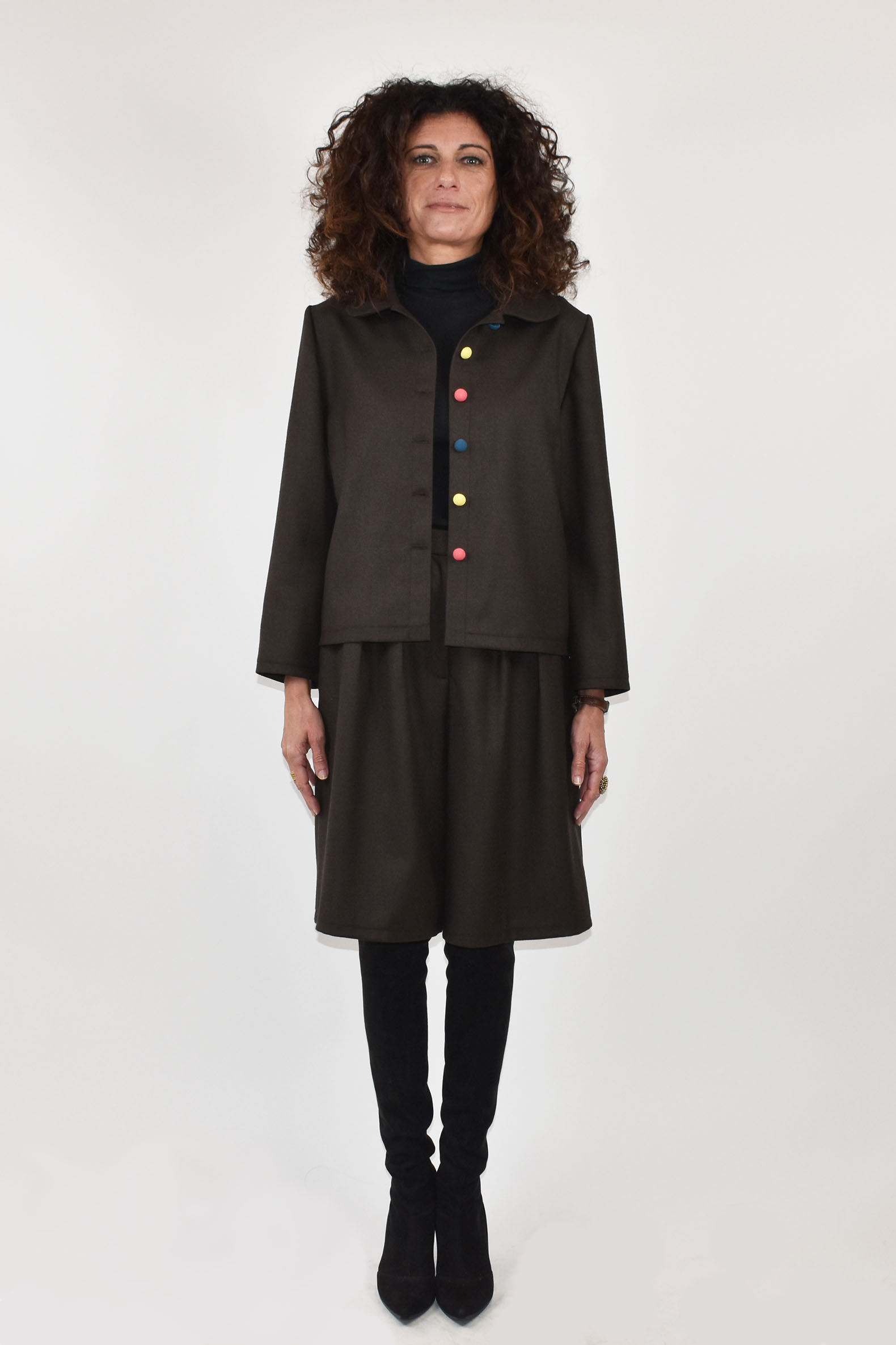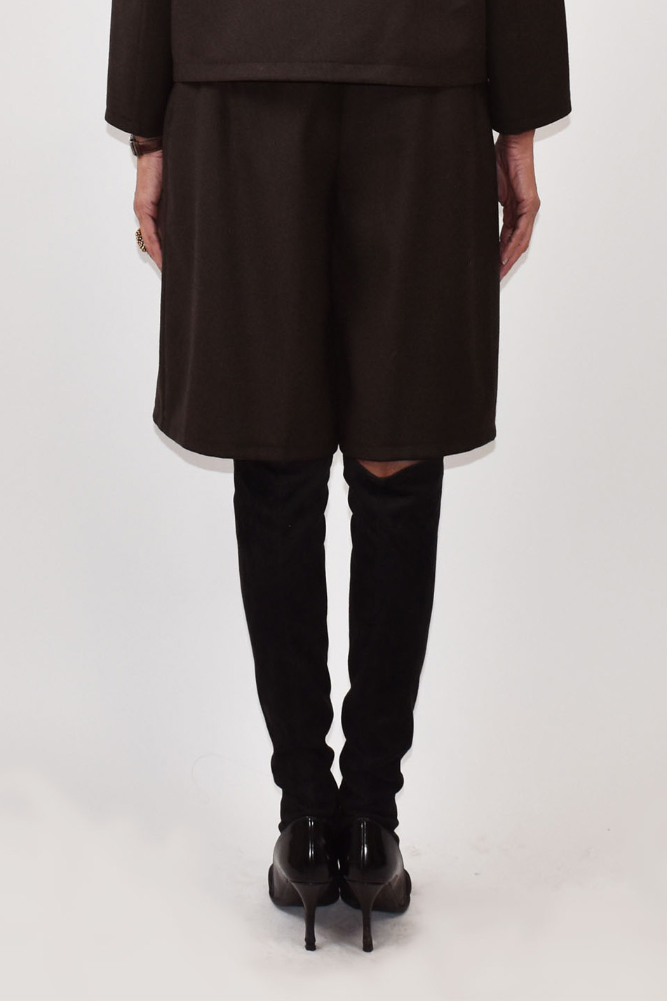La gonna pantalone 1911, in flanella color cioccolato, presenta una linea ampia e confortevole e una lunghezza al ginocchio. Le tasche a filo in cotone lilla donano un twist inatteso. Il cinturino è caratterizzato da una lunga sovrapposizione chiusa da bottoni automatici rivestiti con lo stesso tessuto delle tasche. Il disegno e la lunghezza rendono la gonna pantalone adatta a tutte le fisicità.