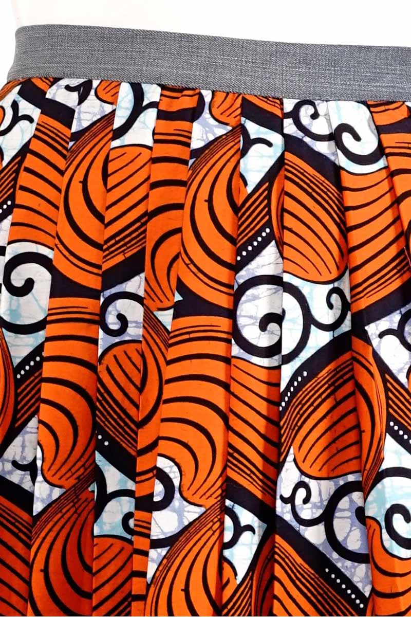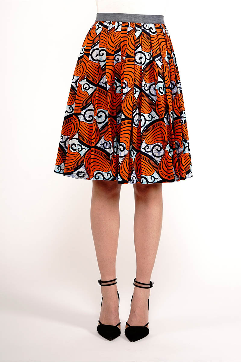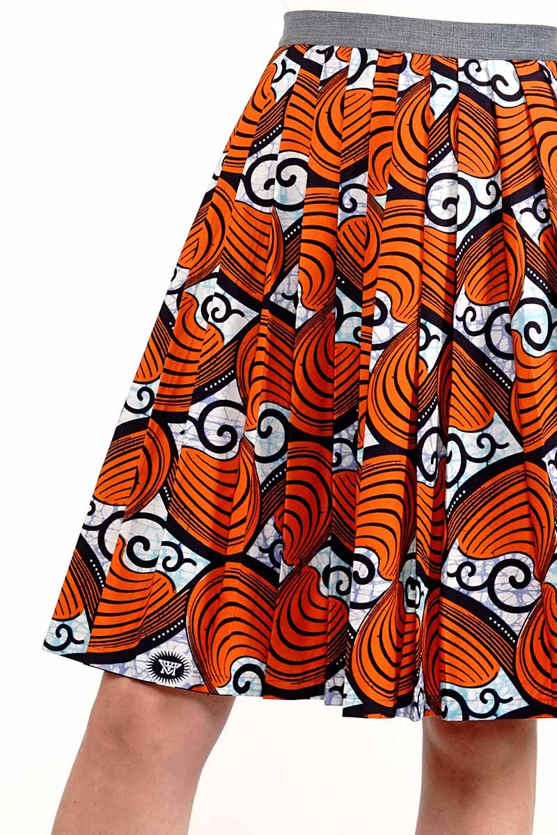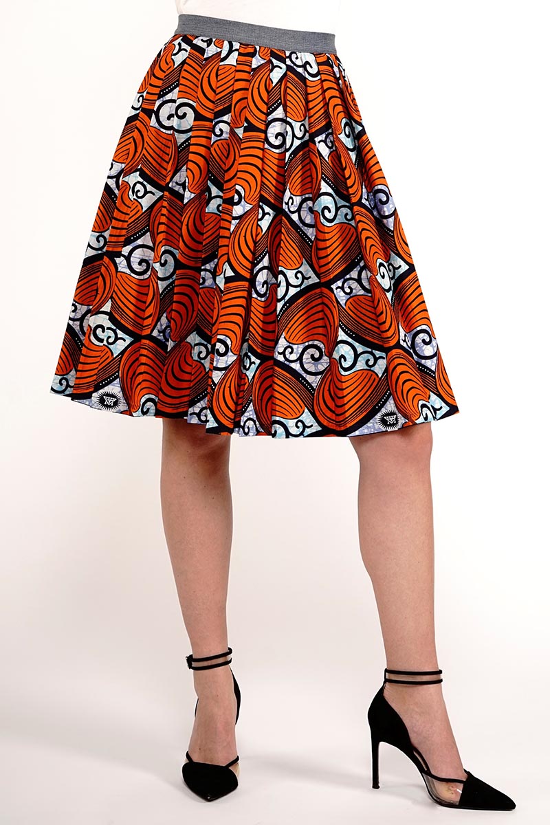 La fantasia geometrica con conchiglie colora la gonna lunga dalle linee fluide con motivo a pieghe sul davanti in cotone superwax 100%.