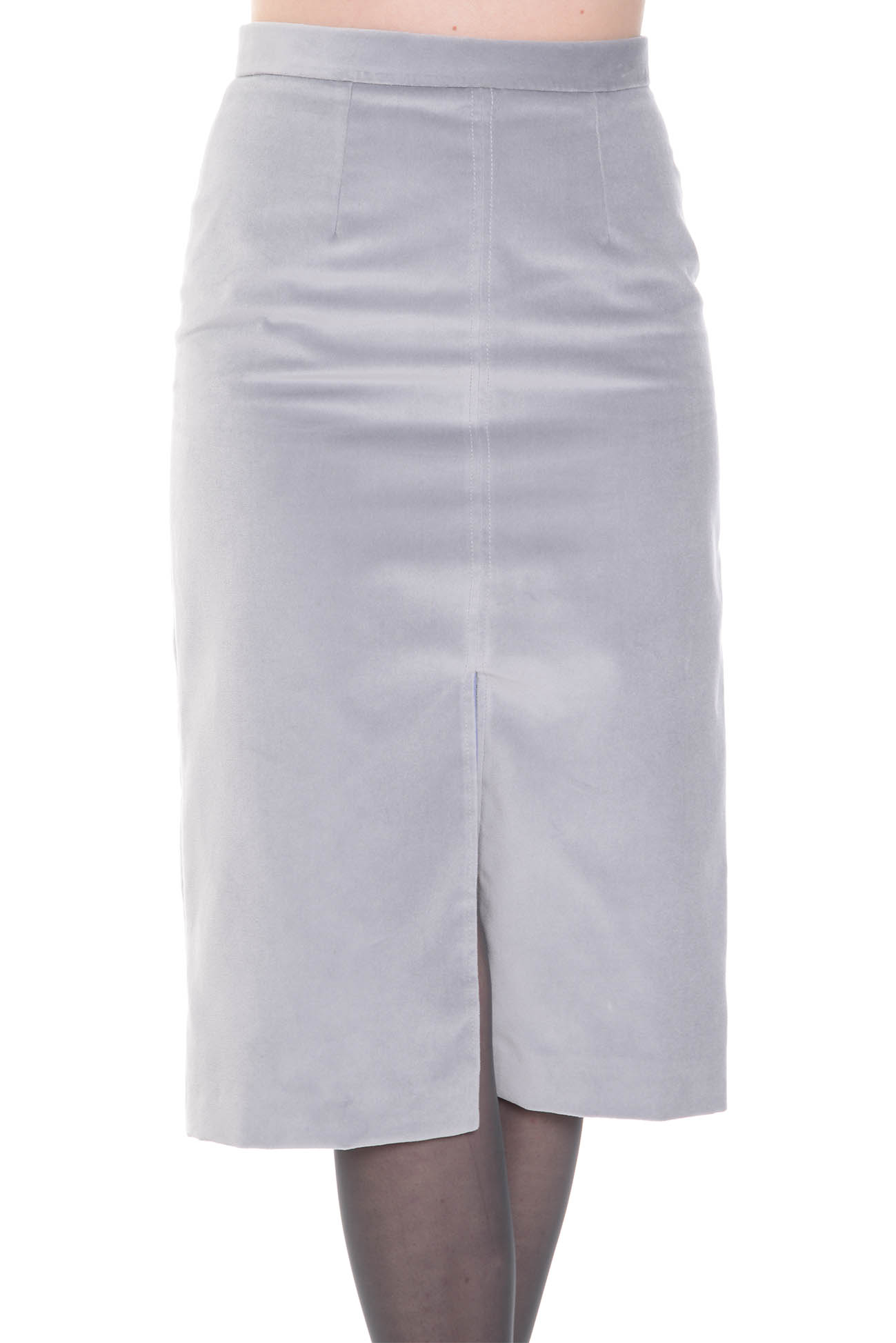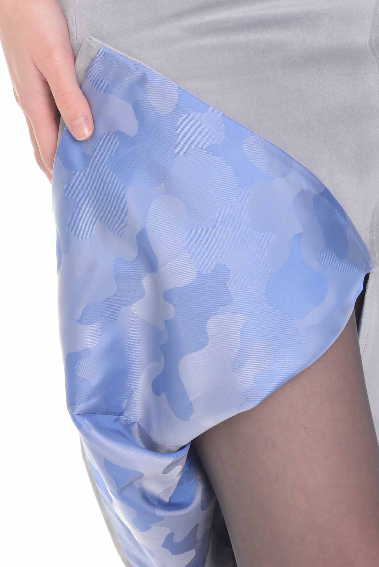 La gonna longuette in velluto liscio grigio argento presenta un motivo di impunture sul davanti che incornicia lo spacco profondo. La gonna è foderata in cupro camouflage celeste.