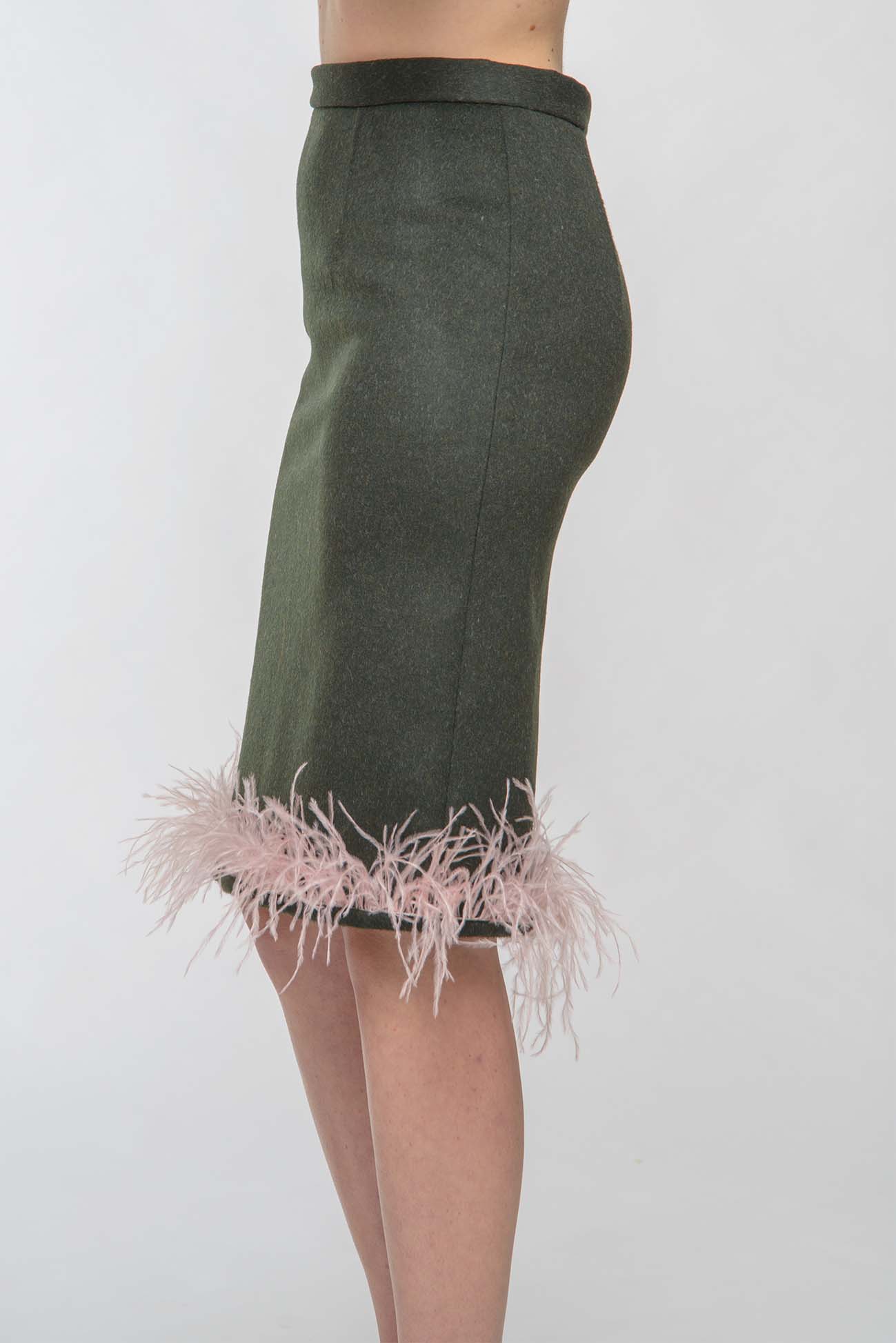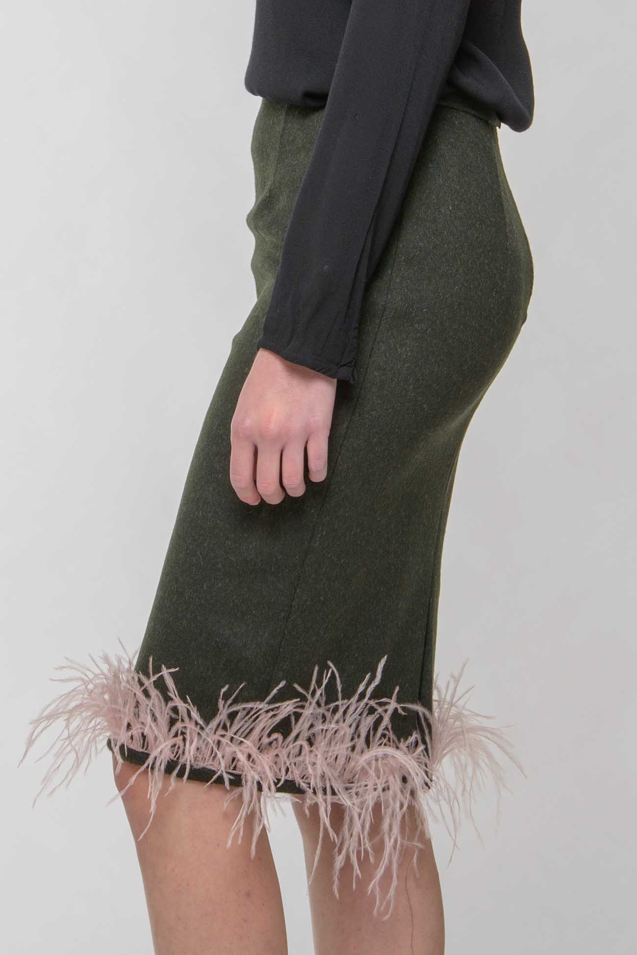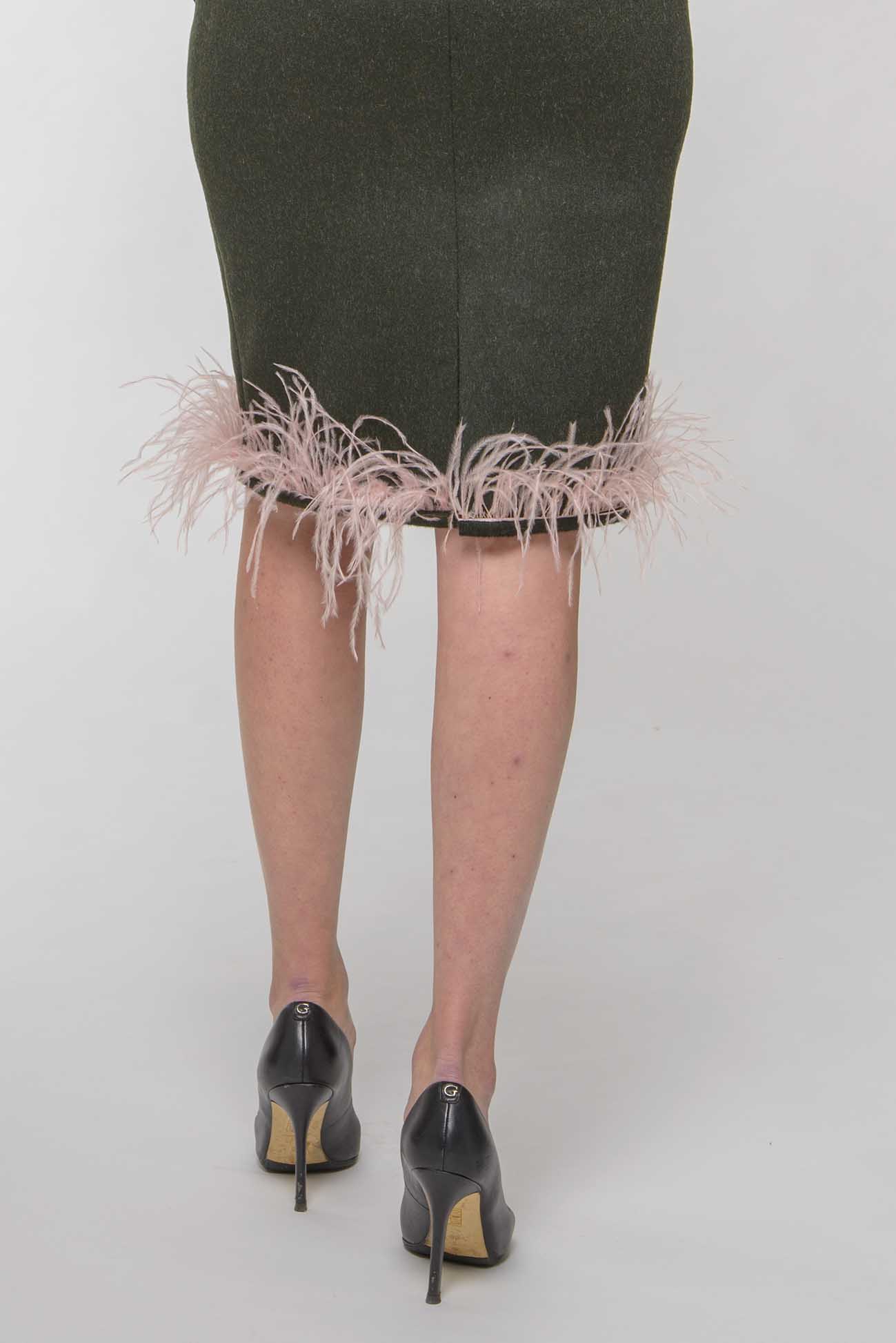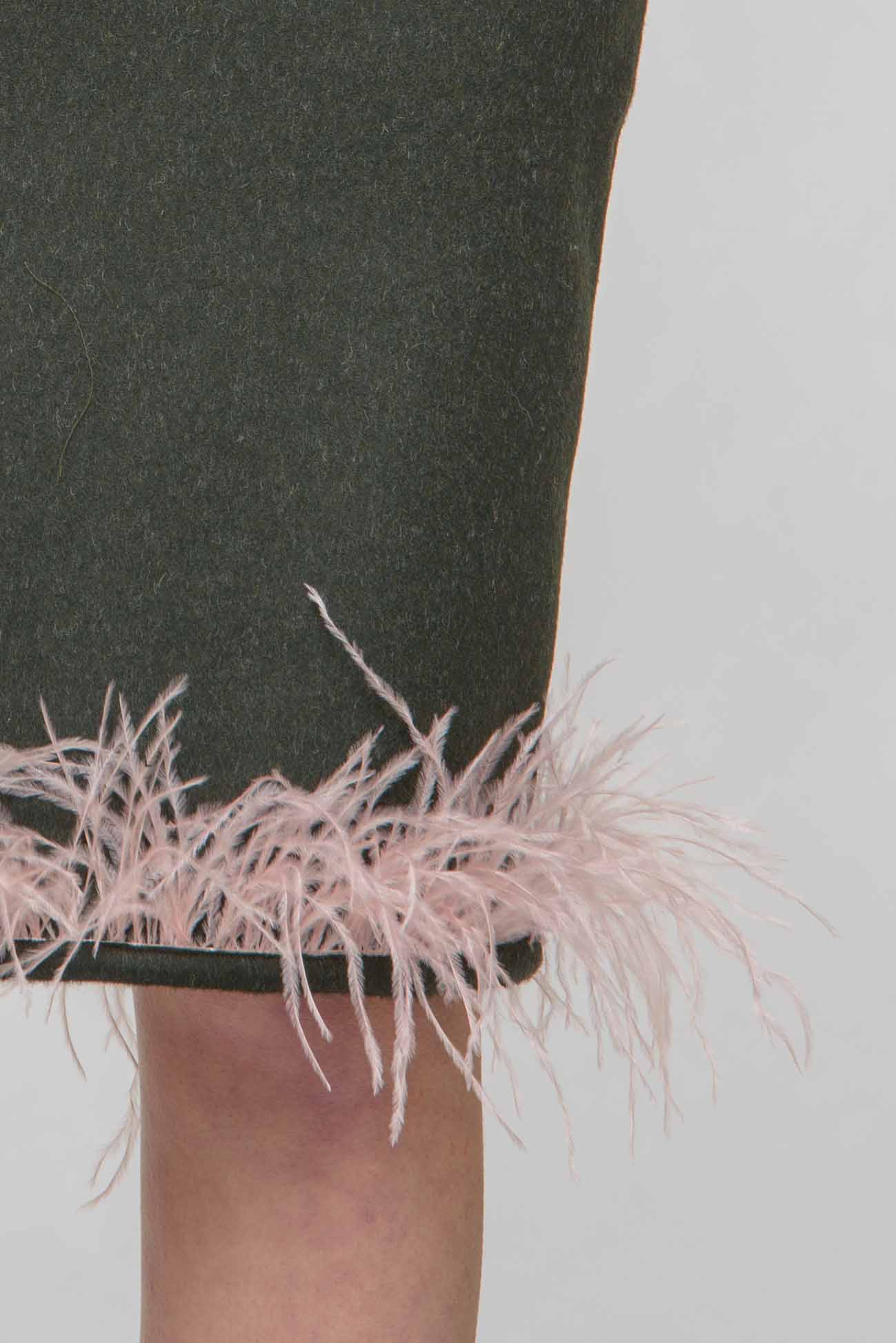 La gonna a tubino in loden verde bottiglia presenta sul fondo una bordatura in piume di struzzo sintetiche rosa cipria e uno spacco centrale dietro.