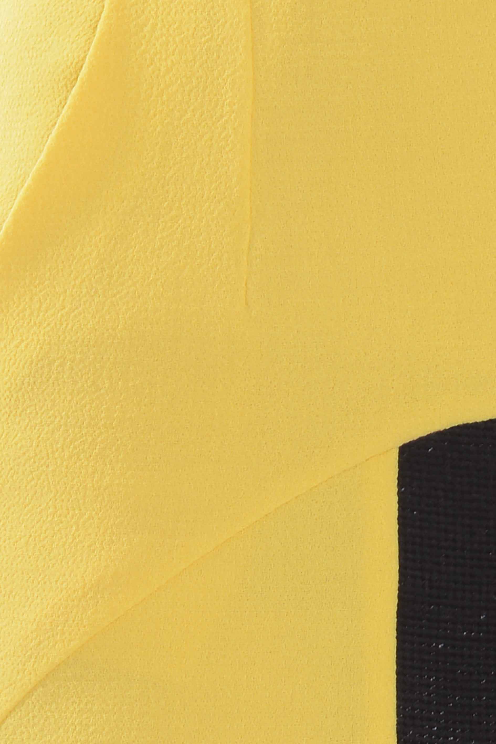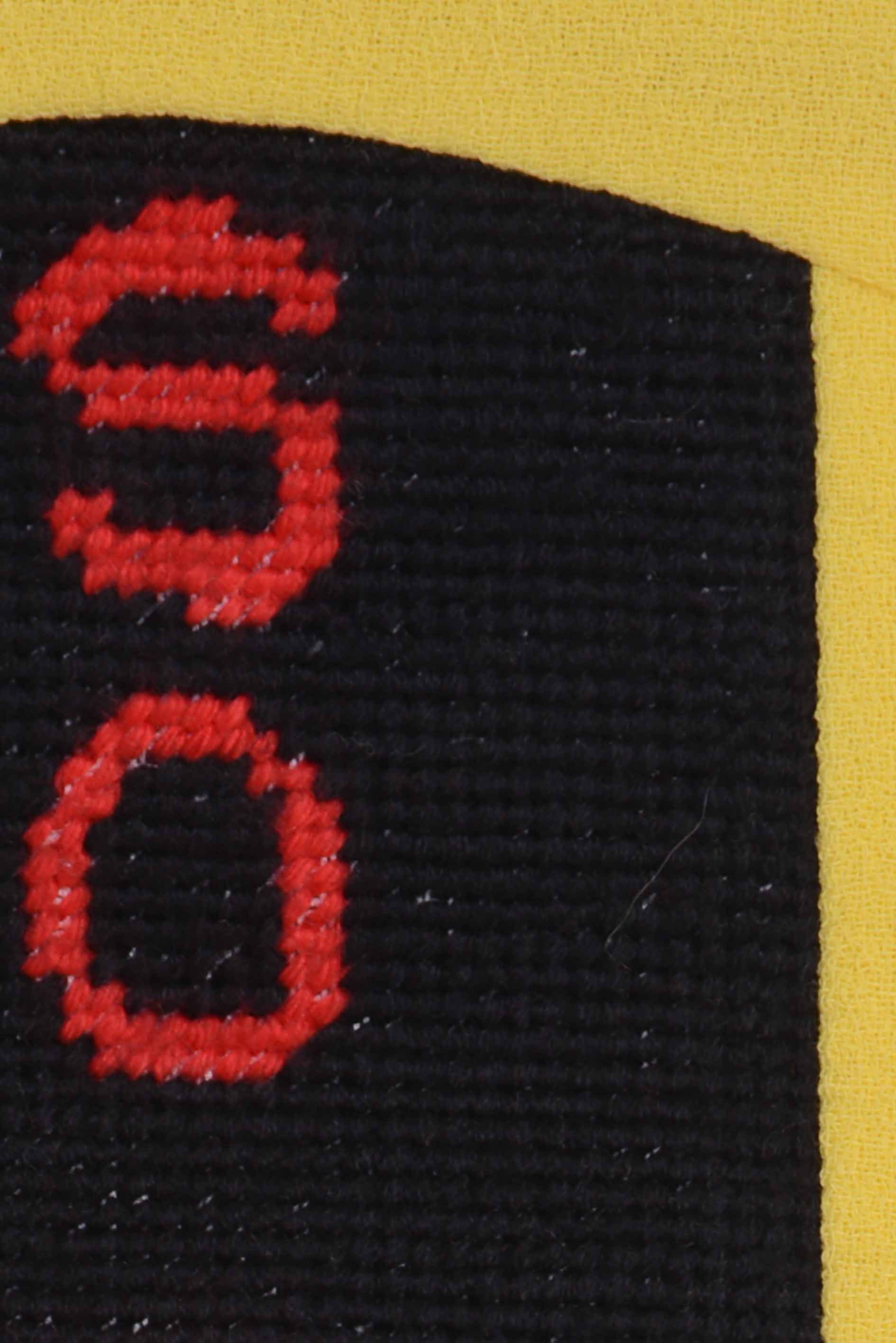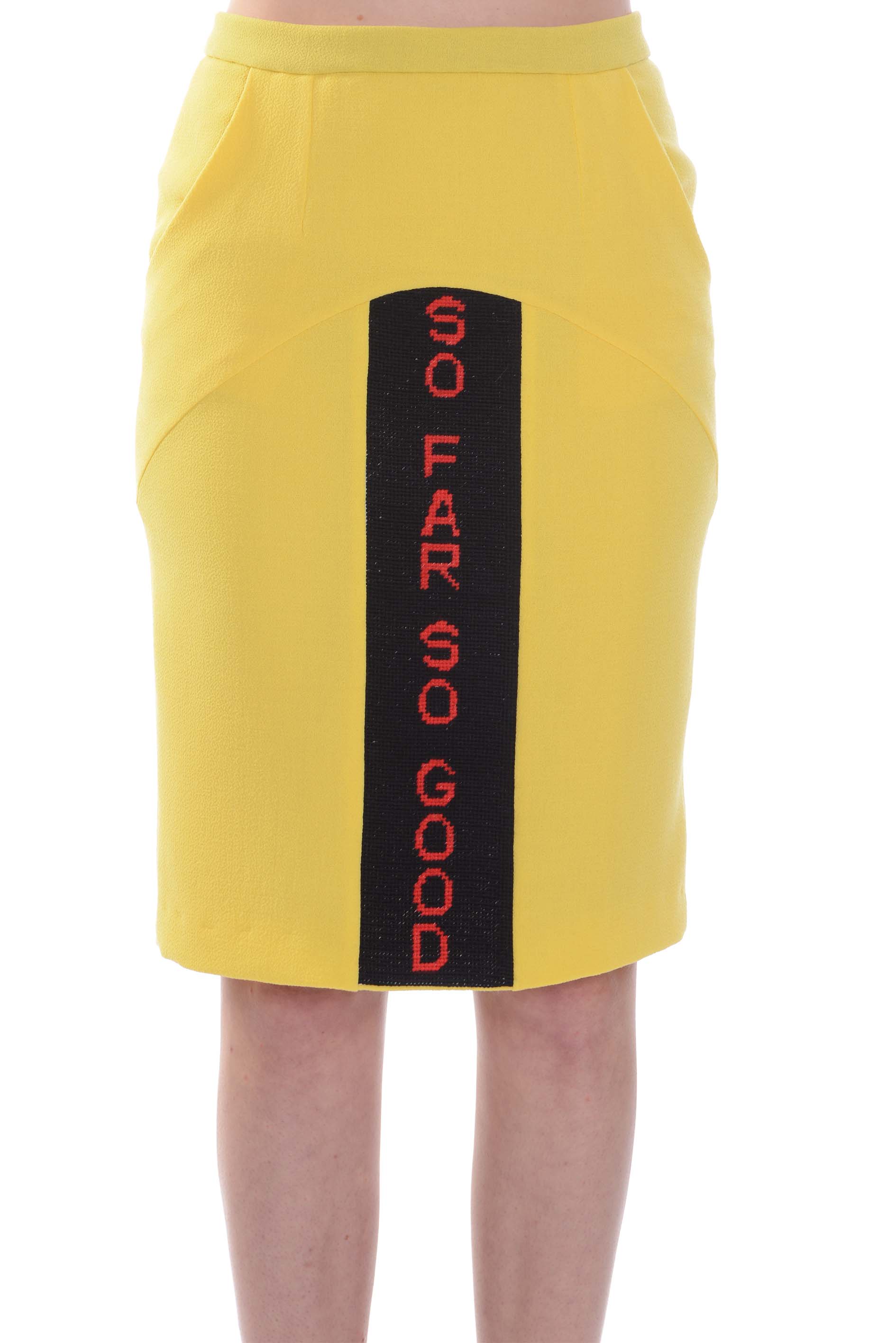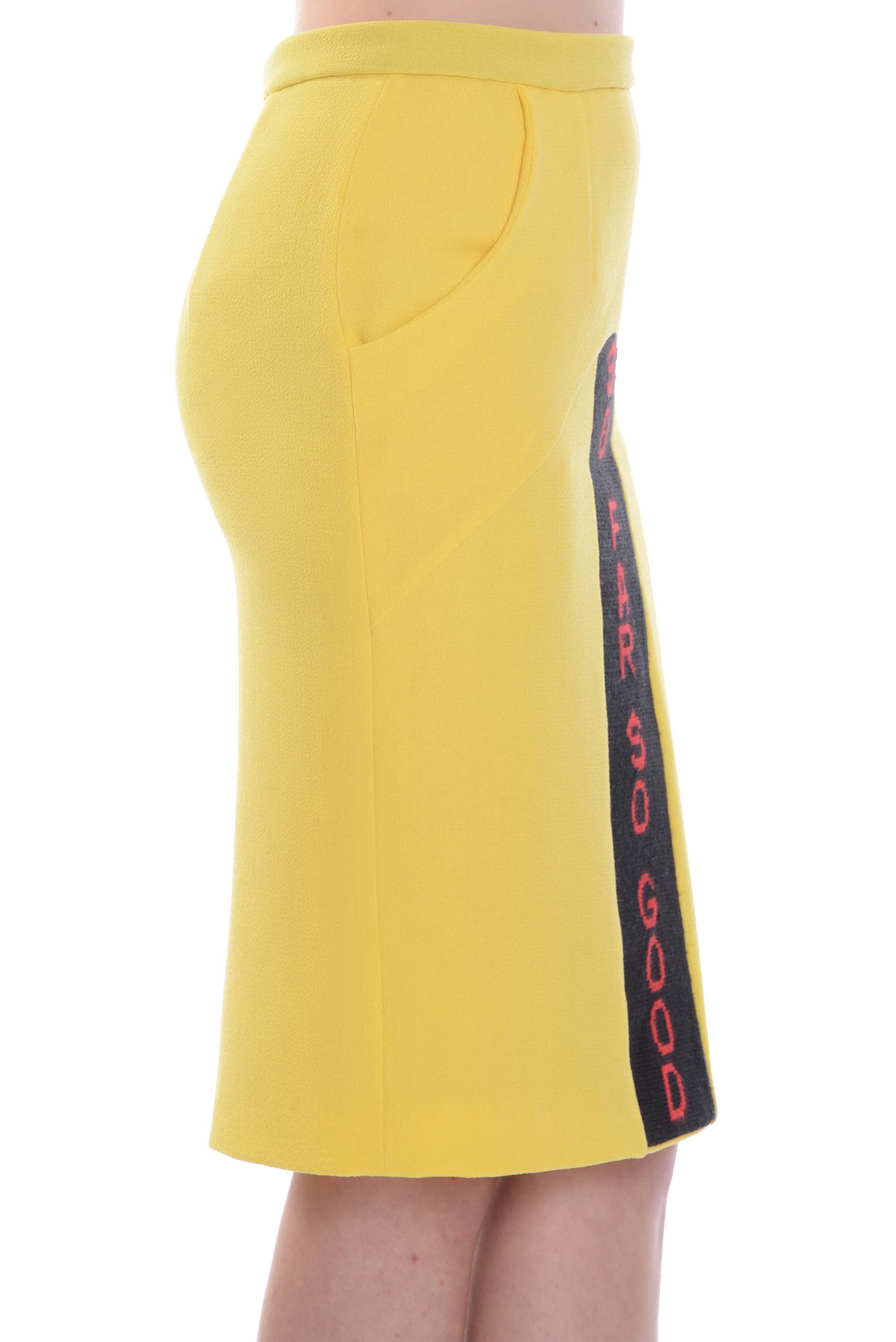 La gonna a tubino in doppio crepe di lana giallo limone presenta sul davanti un motivo di cuciture curve, un inserto ricamato a mano a mezzopunto con scritta e uno spacco centrale dietro. La gonna è foderata in cupro.