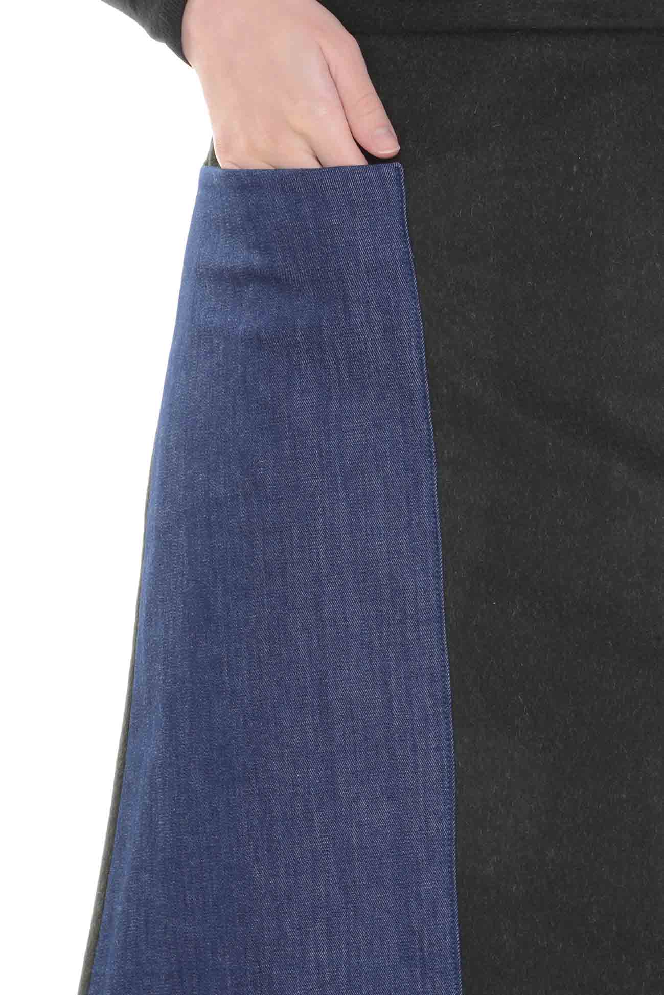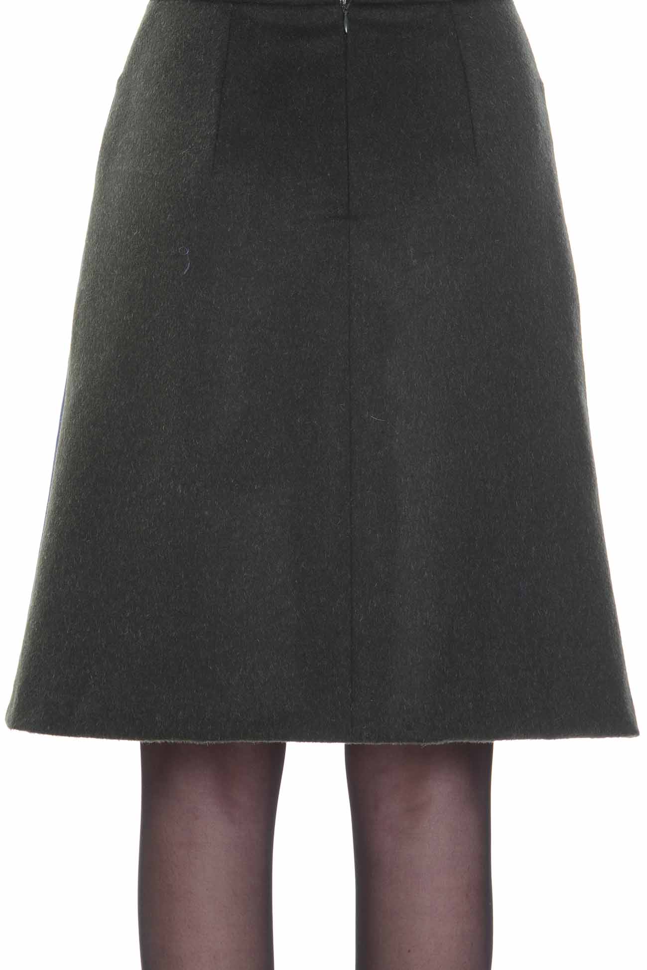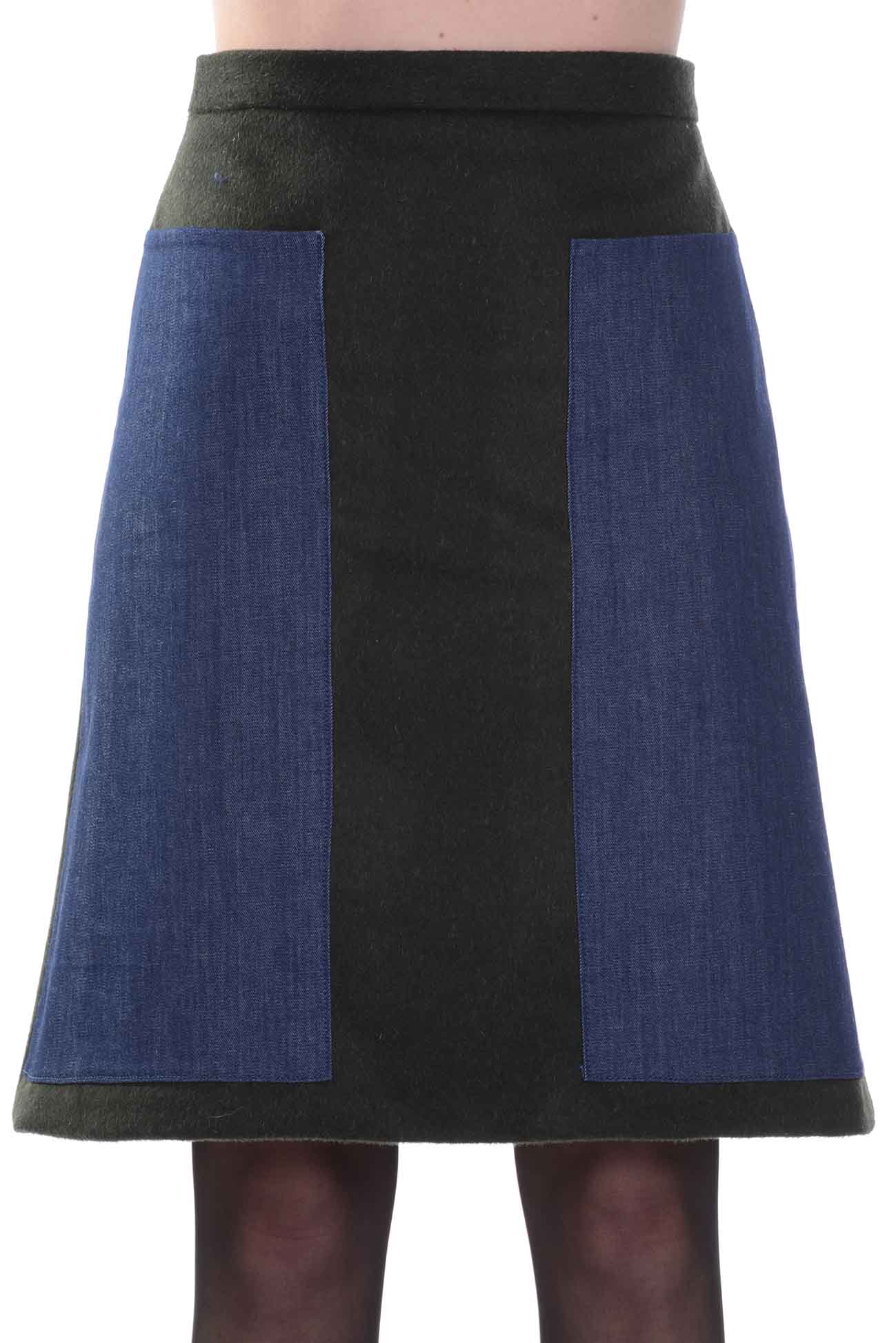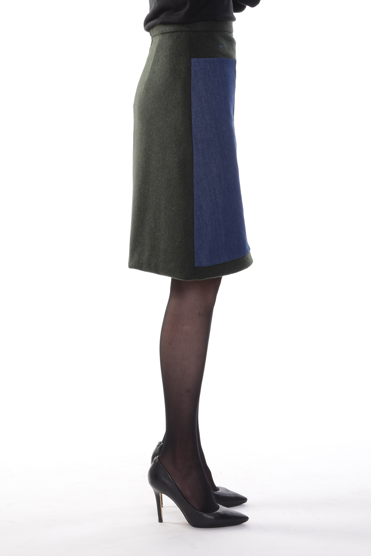 La gonna svasata in loden verde bottiglia presenta sul davanti due grandi applicazioni geometriche che contengono le tasche. La gonna è foderata in twill di cupro blu.